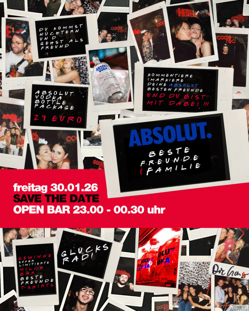 Wir feiern das Ende vom Dry January mit unseren ABSOLUT besten Freunden und Familie. Freut euch auf viele Specials und eine OPEN BAR von 23.00 bis 00.30 Uhr.